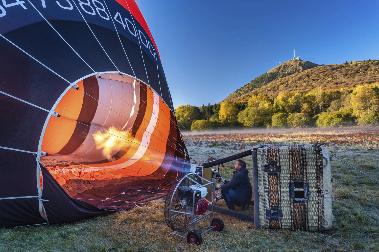 Survoler le Parc naturel régional des Volcans d’Auvergne et son Puy de Dôme le plus célèbre. Tel est l’objet de ce vol avec le prestataire Auvergne Montgolfières, au départ du village d’Olby, près de Clermont-Ferrand, dès potron-minet - si la météo est favorable. Après le décollage, le voyage au gré du vent n’est que ravissement et contemplation. Sous les pieds, on découvre le carroyage bocager des villages du plateau, Mazaye, Champille, Grand Chambois… Au dessus de la brume, le soleil perce et éclaire la ligne de crête du puy de Dôme (1 464 m). Sublime estampe avec, à gauche, le puy de Côme et, derrière lui, les puys de Clerziou et Pariou. Plus loin, on aperçoit aussi le massif du Sancy, dominé sous cet angle par la dent rocheuse de la Banne d’Ordanche. C’est sublime.