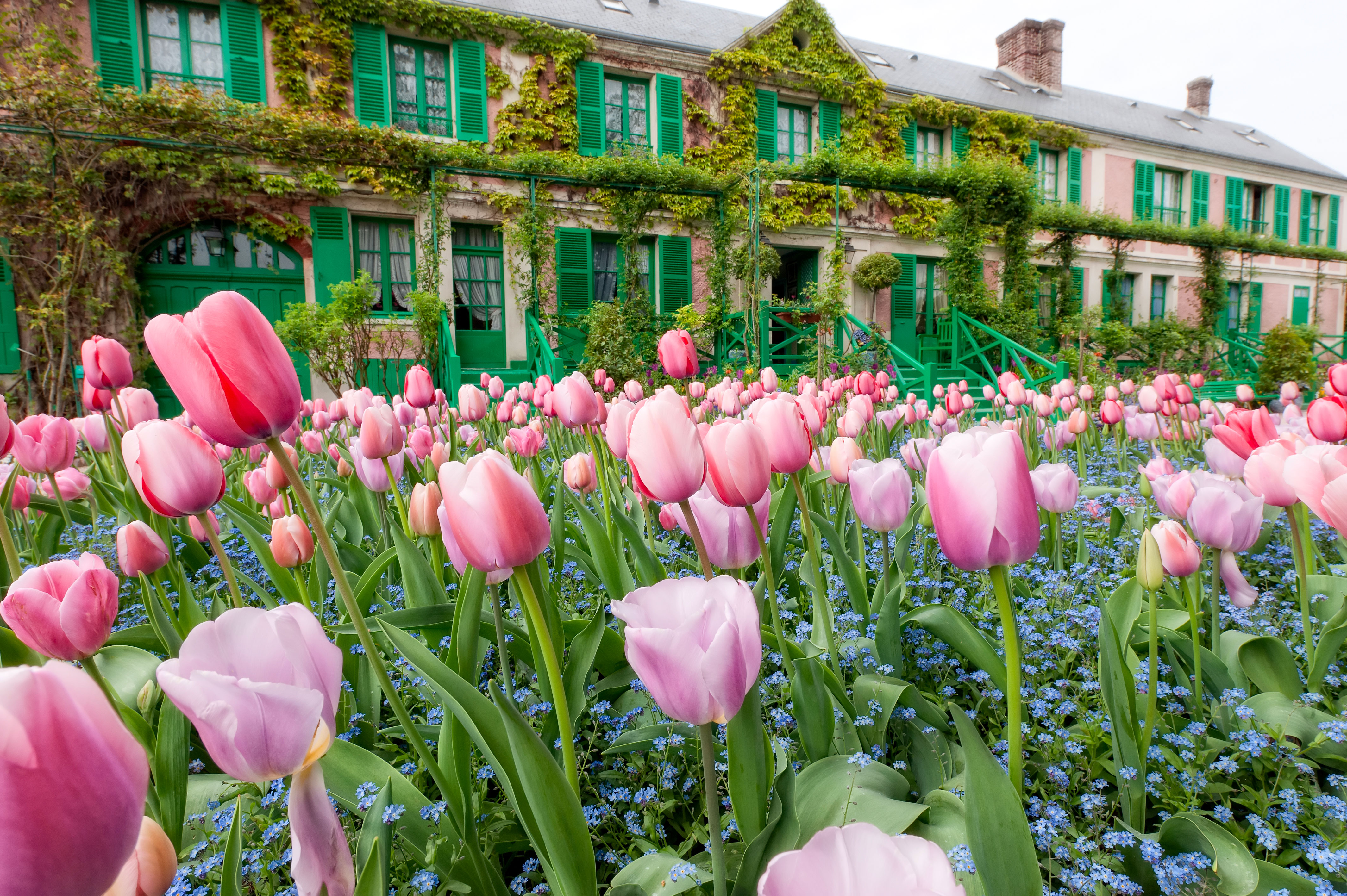 Epoustouflé. Telle est l’émotion qui saisit Claude Monet lorsqu’en mai 1886, à l’invitation du secrétaire de l’ambassade de France à La Haye, il découvre les champs de tulipes de Hollande. De quoi le convaincre au retour à Giverny de recréer des parterres avec ces fleurs. Depuis, les tulipes mais aussi les myosotis et les œillets forment un tapis coloré que des milliers de visiteurs du monde entier viennent admirer chaque année au printemps. Particulièrement appréciée par le peintre, la couleur rose envahit les jardins, associée au bleu des myosotis. Les jardiniers du lieu mélangent à l’automne 3 catégories de tulipes, les hâtives, semi-hâtives et tardives, permettant au public d’en profiter un mois durant.